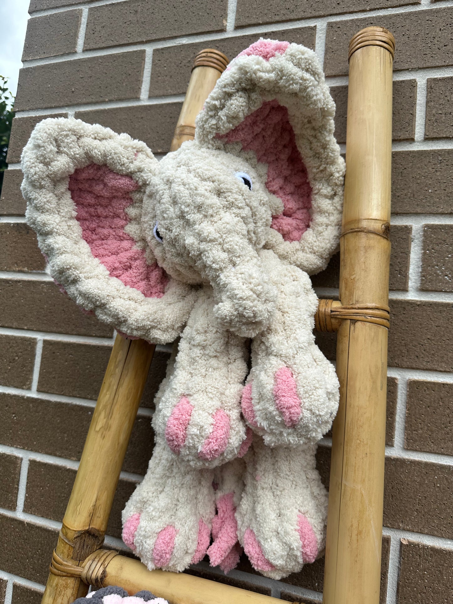 Introduce a touch of handmade charm with Emmy the Elephant, a beautifully crafted hand-knit elephant plushie made from soft, chunky knit yarn. Standing approximately 16 inches tall, Emmy is filled with plush stuffing in both the head and body, making her irresistibly soft and huggable.